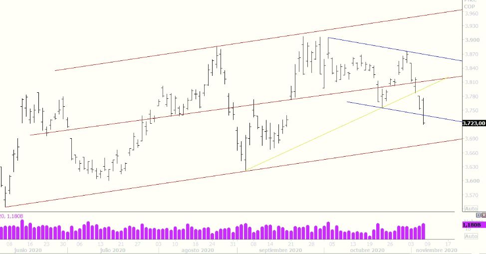 Para este próximo lunes la tendencia debería seguir incluso a niveles de 3678 (piso del canal alcista de largo plazo), esto puede suceder si los inversionistas siguen con un sentimiento positivo en el comportamiento de la moneda. Sin embargo, puede haber retrocesos que incluso podrían tocar 3750. En caso extremo, de salir compradores o algún tipo de riesgo que los inversionistas no tengan en su panorama, el punto de inflexión de la tendencia bajista sería 3777. Si llegase a operar por encima de ese nivel, la tendencia cambiaría y el target sería entonces 3815/3830 (zona media del canal de largo plazo)