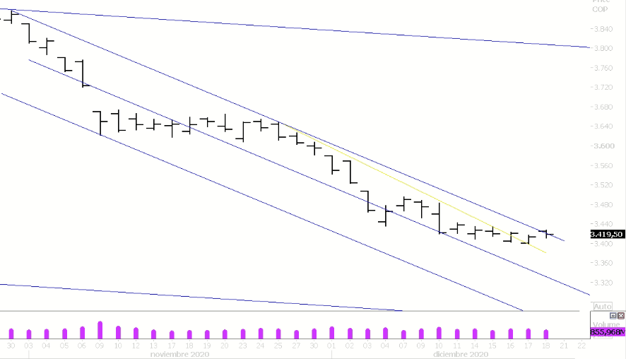 Para el día lunes 21 de diciembre esperamos que el dólar se mantenga dentro del rango 3400/3435. El mercado quebró al alza el canal bajista, sin embargo, la tendencia no se ha negado aun debido a que el pivote de 3434.95 no ha sido sobrepasado. El quiebre del canal de la tendencia bajista es una alerta de que el descenso de los precios puede estar llegando a su fin, pero necesita dos cosas para comprobarlo: (a) operar arriba del 3434.95 y (b) que en el corto plazo (marco de tiempo horario) se de una tendencia alcista. Por ahora el mercado se mantiene en un rango de precios, solo hasta que la oferta sea más grande que la demanda o al contrario, la moneda podría tener una tendencia definida.