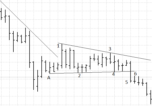 En la medida que las exploraciones hacia arriba y hacia abajo fallan en conseguir seguidores en los mismos niveles de precio donde se habían efectuado transacciones en el pasado, se genera un comportamiento en los precios se que asemeja a un triangulo o una bisagra.