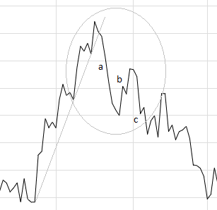 Después de la caída, se observa una onda alcista de menor magnitud y duración (b) que viene seguida de otra onda bajista de mayor magnitud y duración (c). Es en esta última onda (c) en la que se confirma que la tendencia alcista original ha finalizado y que ahora estamos en una nueva tendencia bajista.