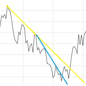 No obstante, existen casos en los cuales, la tendencia se acelera, para lo cual nuevamente la linea recta vuelve a prestar un gran servicio. En nuestro ejemplo los precios comienzan a caer cada vez mas rápido después del retroceso que nos permitió identificar la desaceleración de la tendencia. Para reflejar esa realidad, lo que hacemos es rotar la linea hacia adentro desde el último punto de contacto del precio y la linea, dando origen a la linea azul del gráfico superior.
