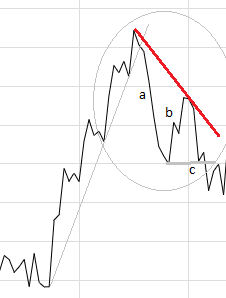En nuestro ejemplo, la linea roja (Linea de Tendencia Bajista) se debe trazar solamente cuando se ha confirmado la tendencia bajista, lo cual ocurre en el momento en que la onda (c) supera en magnitud a la onda (b) y se marca un nuevo precio mínimo.(linea gris horizontal)
