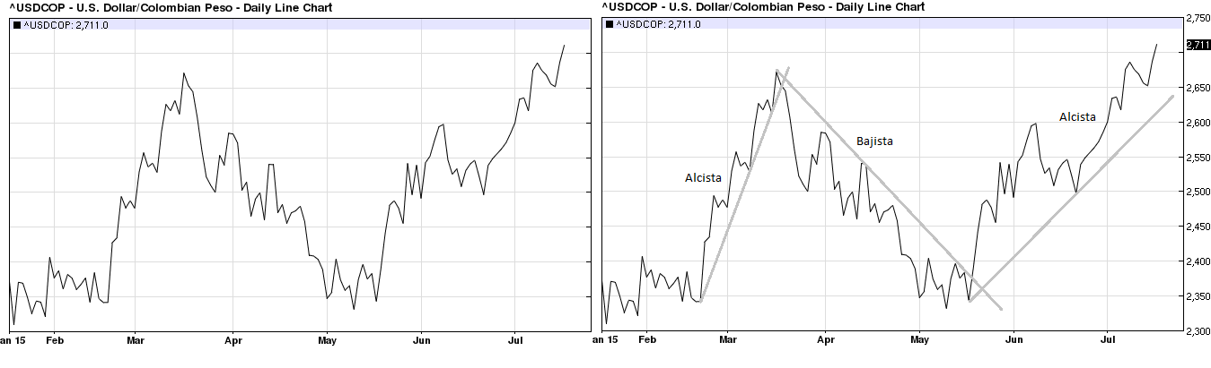 Para ilustrar este concepto vamos a utilizar ejemplos de tendencias en el dolar americano frente al peso colombiano USDCOP.